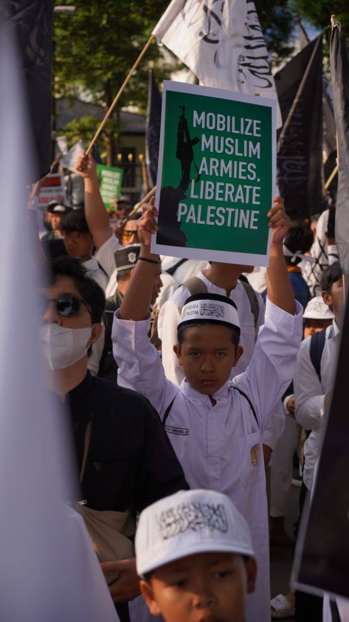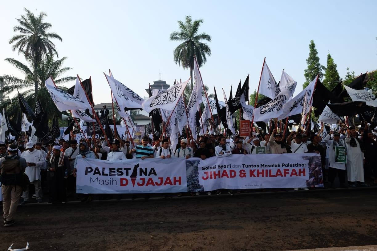 Pula tampak di tengah aksi yang dimulai pukul 06.00 WIB hingga jam 10.00 WIB tersebut para peserta memegang poster-poster seruan di antaranya Kirim Tentara Muslim, Bebaskan Palestina hingga Gencatan Senjata Bukan Akhir Penjajahan Zionis Yahudi.