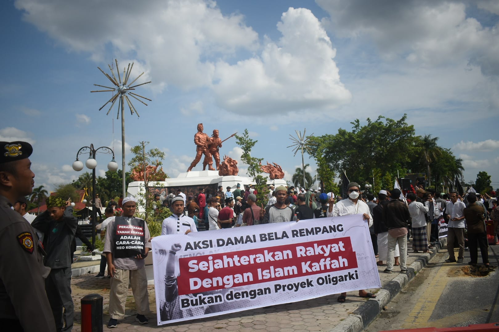 Terlihat beberapa poster dan spanduk tuntutan dari peserta aksi, salah satunya bertuliskan Kedzaliman di Rempang Bukti Pemerintah Tunduk kepada Oligarki.[] Adz