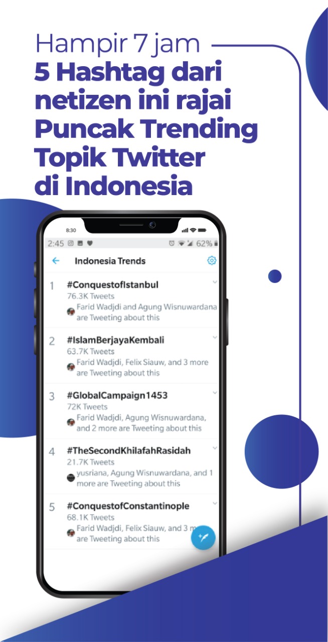 Lima tagar trending ini merajai mulai pukul 10 hingga 17 WIB pada 15 Januari lalu. Artinya, 7 jam trending menguasai jagat twitter. “Jika KPOP dilandasi kecintaan mereka terhadap grup musik KPOP-nya, bisa jadi warganet yang mengangkat isu ini dilandasi juga dengan perasaan rindu akan kejayaan Islam di masa lalu,” ujar Arief memprediksi.