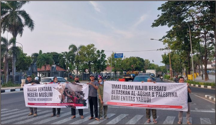 Wahai Tentara Negeri Muslim, Palestina Memanggilmu. Begitulah tulisan salah satu spanduk yang diusung sejumlah pemuda dalam aksi damai bentang spanduk bela Palestina, Rabu (11/10/2023) di Tuban.