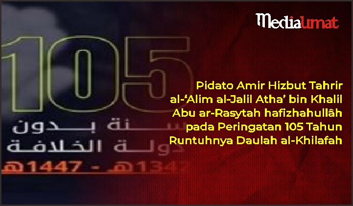 * Pada semisal hari ini 105 tahun lalu di akhir bulan Rajab tahun 1342 H – awal Maret 1924 M, kaum kafir imperialis dipimpin oleh Inggris ketika itu, bekerjasama dengan pengkhianat arab dan Turki berhasil menghancurkan Daulah al-Khilafah, dan penjahat abad itu Mushthafa Kamal mendeklarasaikan kekufuran yang terang-terangan dengan menghapus al-Khilafah, mengepung Khalifah di Istanbul dan mengeluarkannya pada subuh hari itu juga .. Begitulah, gempa mengerikan melanda negeri kaum Muslim dengan penghancuran al-Khilafah pembangkit kemuliaan dan keridhaan Rabb mereka … Dan yang wajib bagi ummat adalah memeranginya dengan pedang sebagaimana yang ada di dalam hadis Rasul saw al-Muttafaq ‘alayh dari ‘Ubadah bin ash-Shamit ra. :
