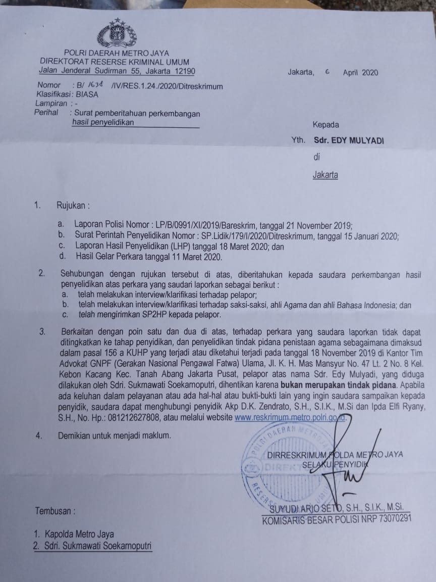 Mediaumat.news – Polisi menghentikan kasus dugaan penistaan agama oleh Sukmawati Soekarnoputri. Alasannya, seperti dalam Surat Pemberitahuan Perkembangan Hasil Penyelidikan Dirreskrimum Polda Metro Jaya yang diterima Sekjen GNPF-Ulama Edy Mulyadi pada 29 April 2020, tidak dapat ditingkatkan menjadi penyidikan karena menurut polisi bukan merupakan tindak pidana.