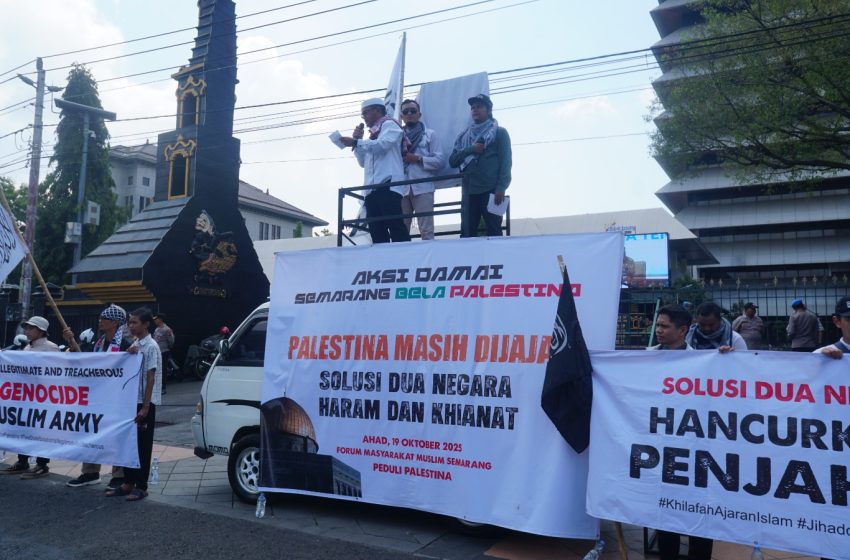 “Aksi Peduli Palestina, Bebaskan Palestina, Dua Negara Bukan Solusi,” tertulis dalam spanduk yang massa usung sembari menyusuri jalan protokol yang dimulai dari titik Nol Kilometer Pulau Bangka, Ahad (19/10/2025) di Kota Pangkalpinang.