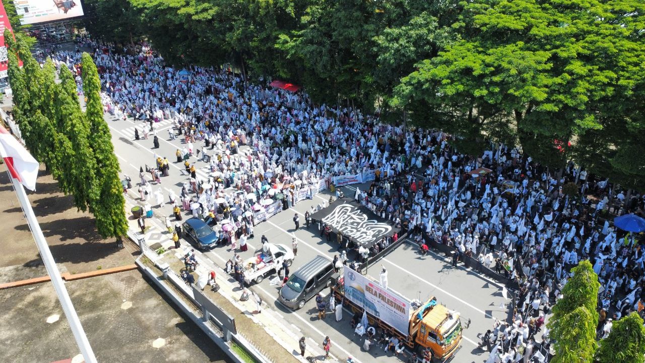 Ribuan umat Islam dari berbagai kalangan, termasuk ulama, muballigh, majelis taklim, pengusaha, intelektual, mahasiswa dan pelajar, serta masyarakat umum, turun ke jalan dalam aksi Mashirah Akbar Bela Palestina, Ahad (2/2/2025).