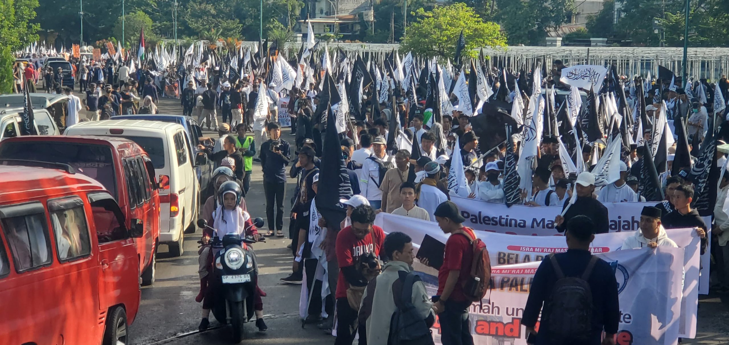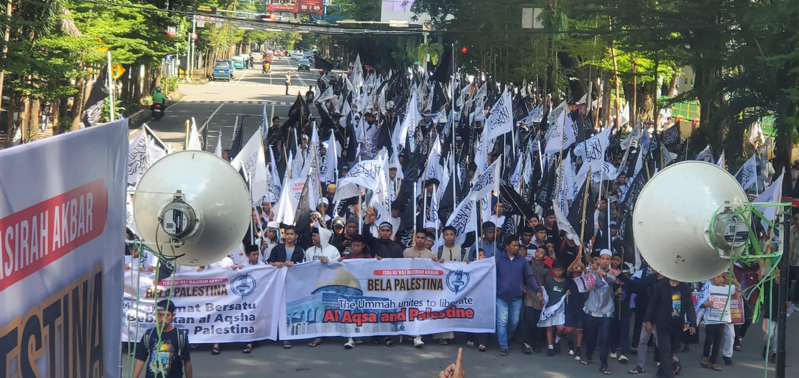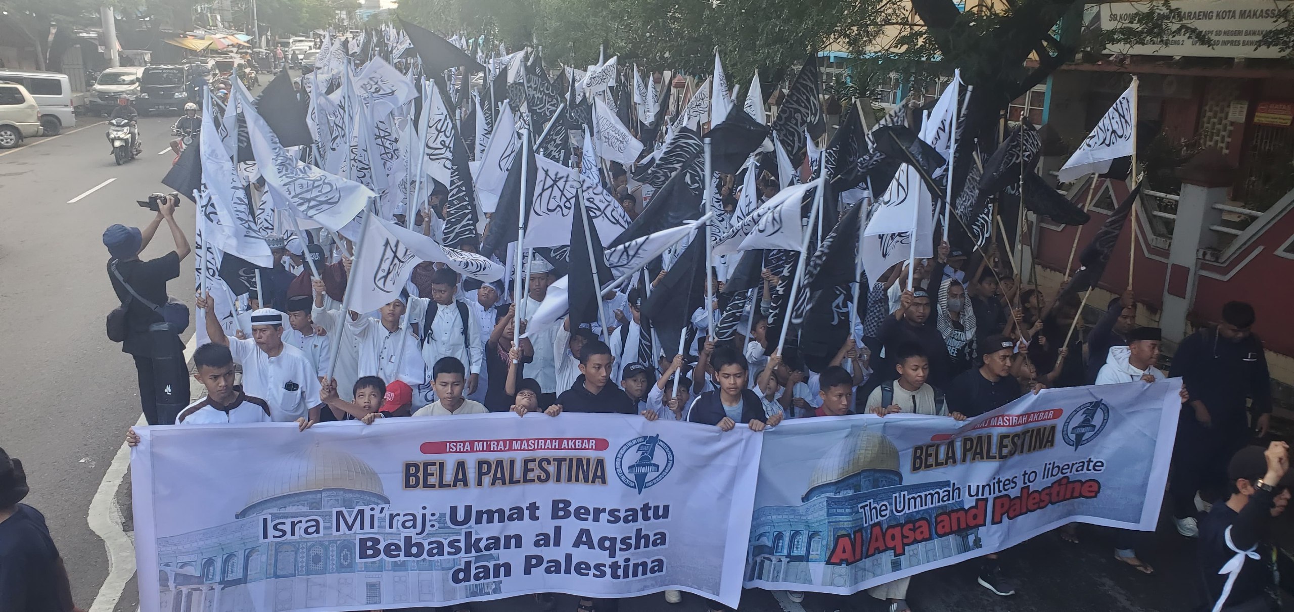 Dengan mengusung tema “Isra’ Mi’raj, Umat Bersatu Bebaskan Al-Aqsha & Palestina”, massa melakukan long march dari Masjid Al-Markaz Al-Islami menuju Monumen Mandala sebagai bentuk solidaritas terhadap perjuangan rakyat Palestina.