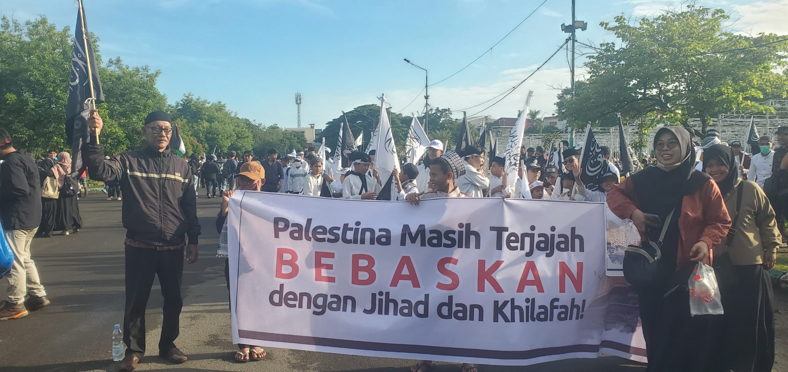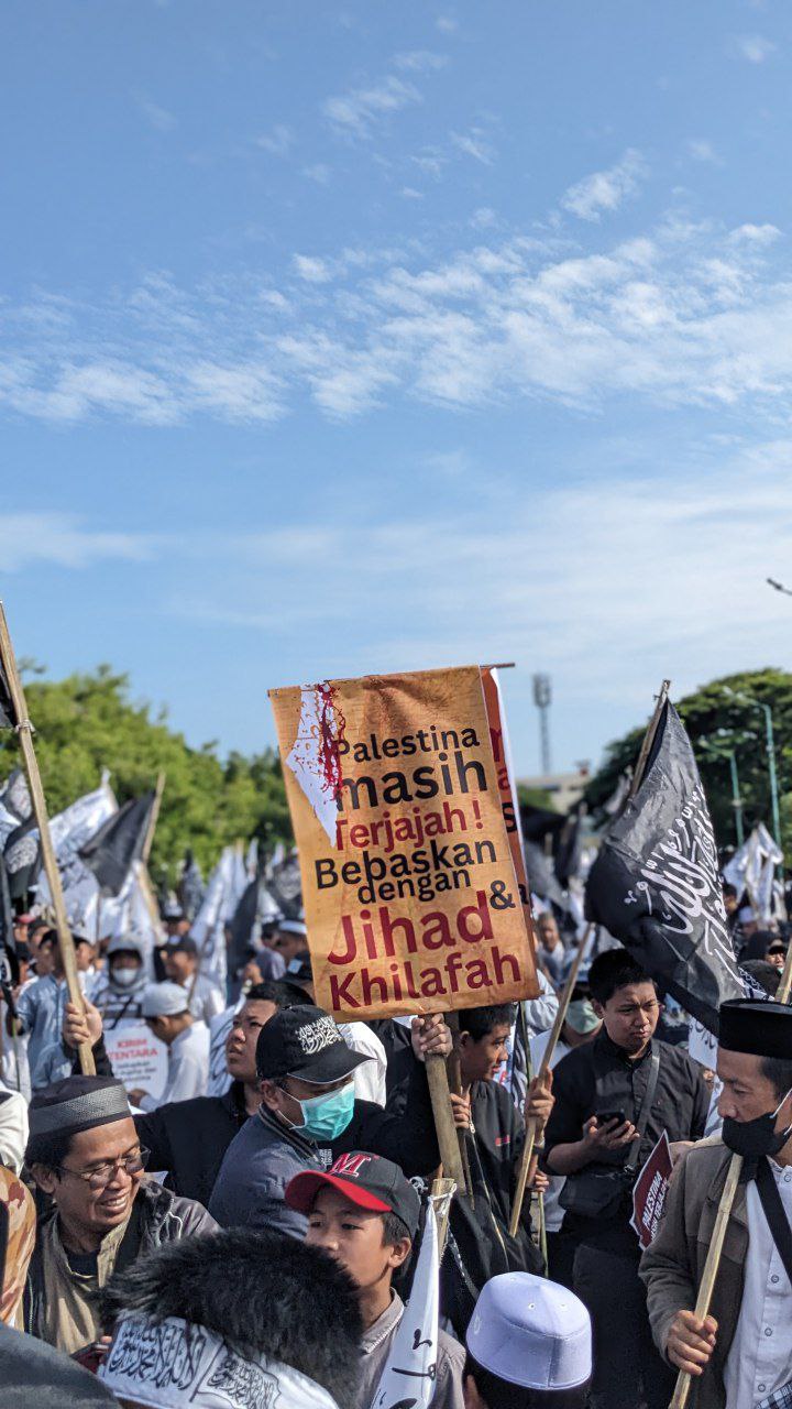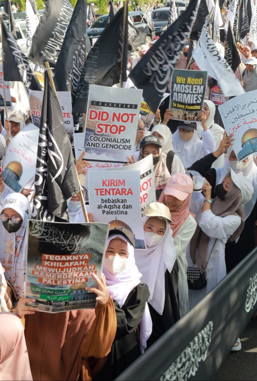 Peserta juga meneriakkan yel-yel “Umat Islam Bersatu Bebaskan Palestina!” dan mengumandangkan shalawat. Peserta juga membawa poster dan spanduk berisikan pesan pembelaan terhadap Palestina bertuliskan Palestina Masih Terjajah, Jihad Khilafah Solusi Palestina, KirimTentara, Selamatkan Palestina