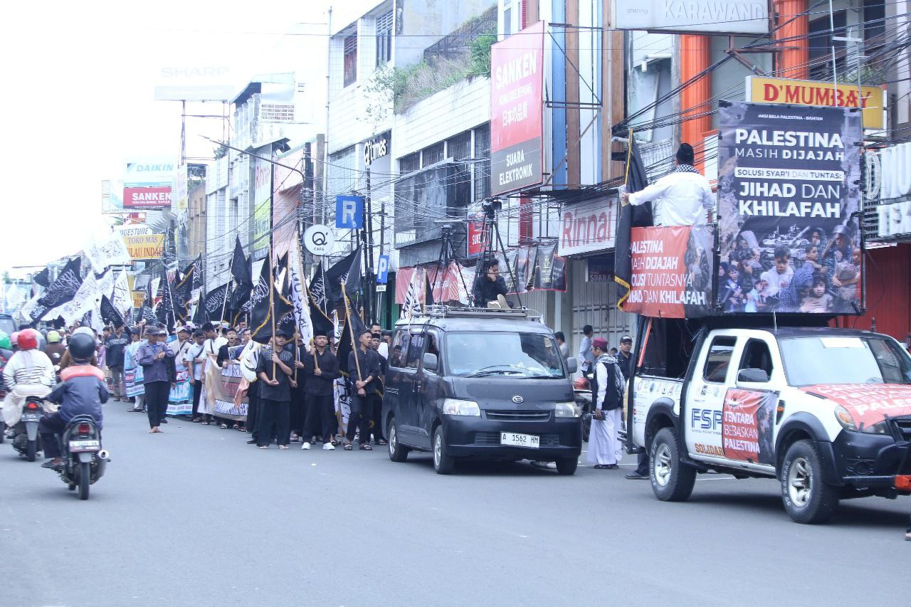 “Palestina Masih Dijajah, Solusi Syar’i dan Tuntas adalah Jihad dan Khilafah,” tulis salah satu spanduk.
