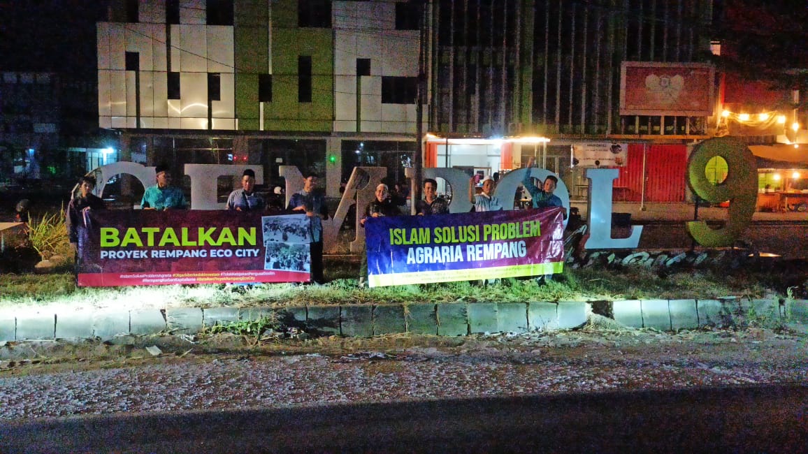 Spanduk-spanduk yang dibentangkan tersebut bertuliskan: Islam Solusi Masalah Agraris Rempang; Batalkan Proyek Rempang Eco City; Mengutamakan Investor Ketimbang Rakyat, Kebijakan Kapitalistik dan Dzalim; dan Mengorbankan Rakyat demi Investasi, Dzalim![]
