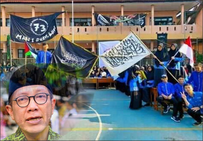 Foto yang diunggah oleh pemilik akun @Karolina_bee11 pada Sabtu, 20 Juli 2019, ini menjadi perhatian publik. Pasalnya, dalam foto tersebut tampak sekelompok siswa berpose di halaman madrasah, mengibarkan dua bendera tauhid berwarna hitam bertuliskan kalimat Laa ilaaha illallah, Muhammadun Rasulullah. Ada juga siswa yang membawa bendera Merah Putih. Sementara pada bagian lain, terlihat spanduk dengan tulisan MAN 1 Sukabumi, yang kemudian direspon oleh Menag melalui akun twitternya.