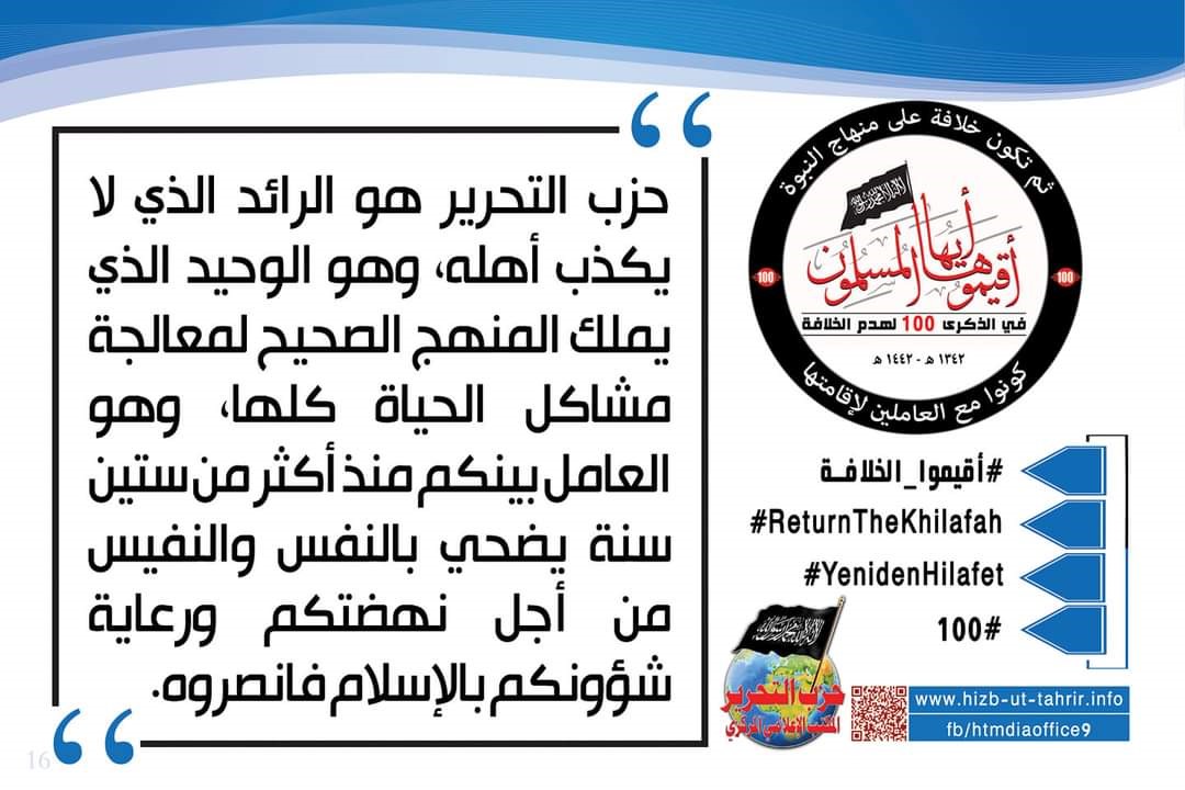 “Hizbut Tahrir adalah pelopor yang tidak mendustakan umat. Hizbut Tahrir adalah satu-satunya yang memiliki cara yang benar untuk menangani semua masalah kehidupan. Sudah lebih dari enam puluh tahun, Hizbut Tahrir berjuang di antara Anda dengan mengorbankan jiwa dan raganya yang begitu berharga, demi kemajuan dan kebangkitan kembali Anda, serta mengurusi urusan Anda dengan Islam. Untuk itu, dukunglah dia.”