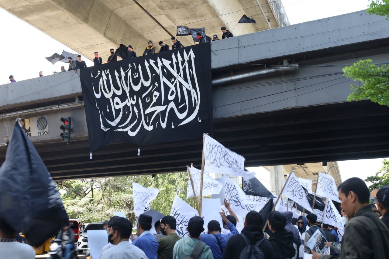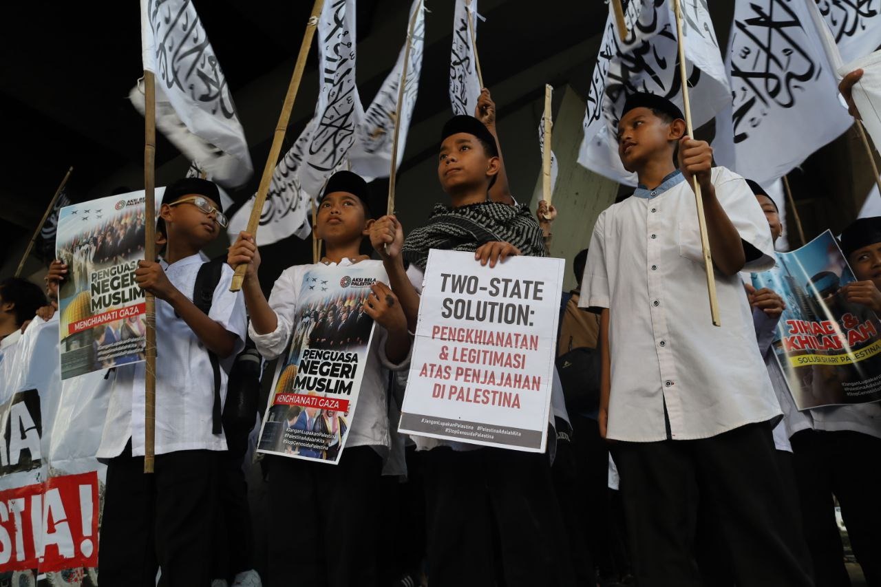 Selain itu, tampak pula spanduk bertuliskan Kirim Tentara, Bebaskan Palestina!