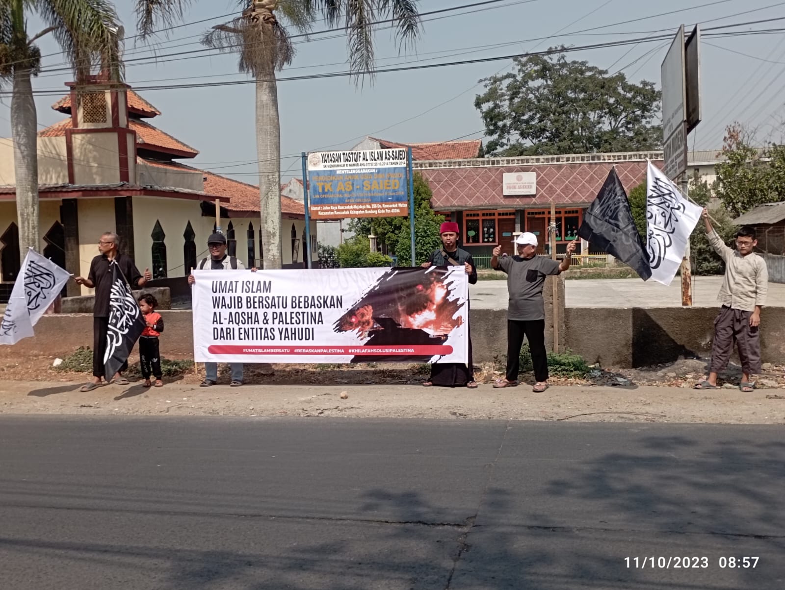“Umat Islam Wajib Bersatu Bebaskan Al-Aqsha dan Palestina dari Entitas Yahudi,” tulis salah satu spanduk yang mereka bentangkan, Rabu (11/10/2023) di Rancaekek, Kabupaten Bandung.
