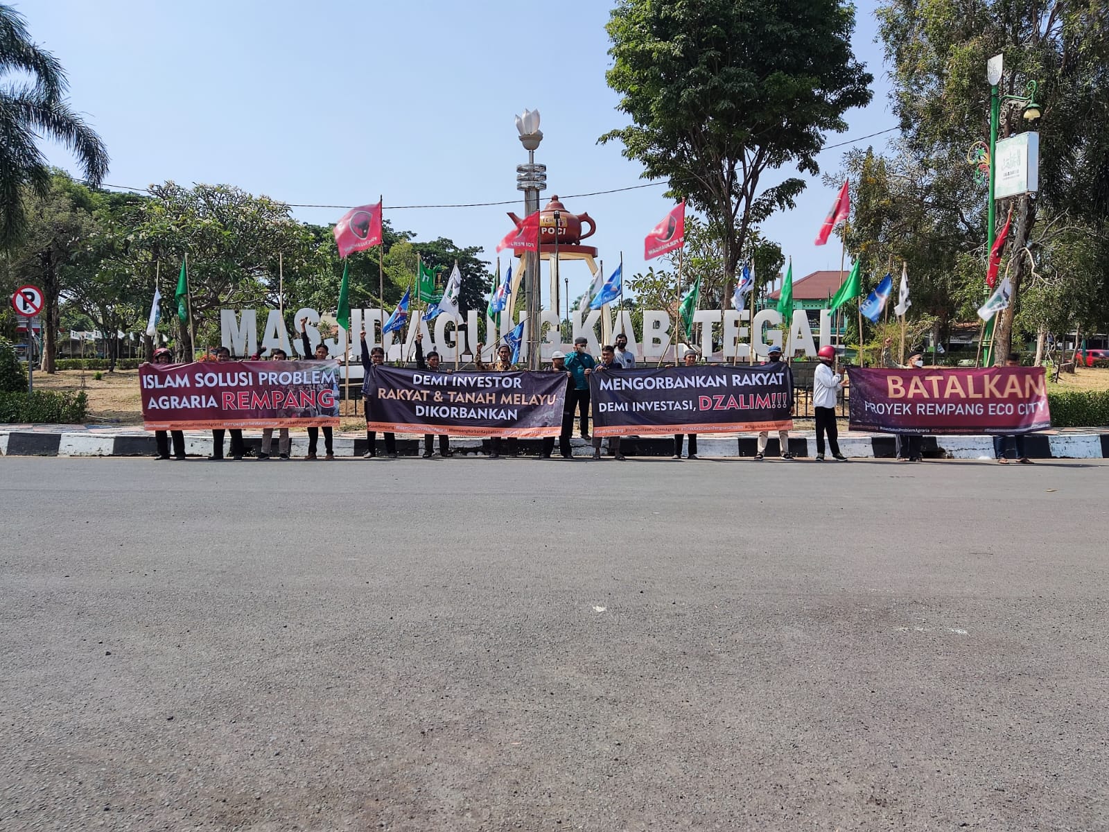 Sedangkan yang lainnya membentangkan spanduk bertuliskan Islam Solusi Problem Agraria Rempang; Mengorbankan Rakyat demi Investasi, Dzalim! dan Demi Investor, Rakyat dan Tanah Melayu Dikorbankan.